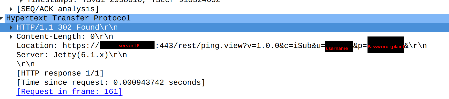 Location: https://***.***.***.***:443/rest/ping.view?v=1.0.0&c=iSub&u=<username>&p=<password>&\r\n